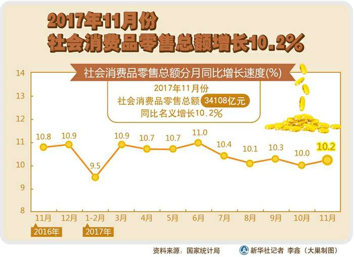 图表:2017年11月份社会消费品零售总额增长10.2% 新华社发 大巢制图